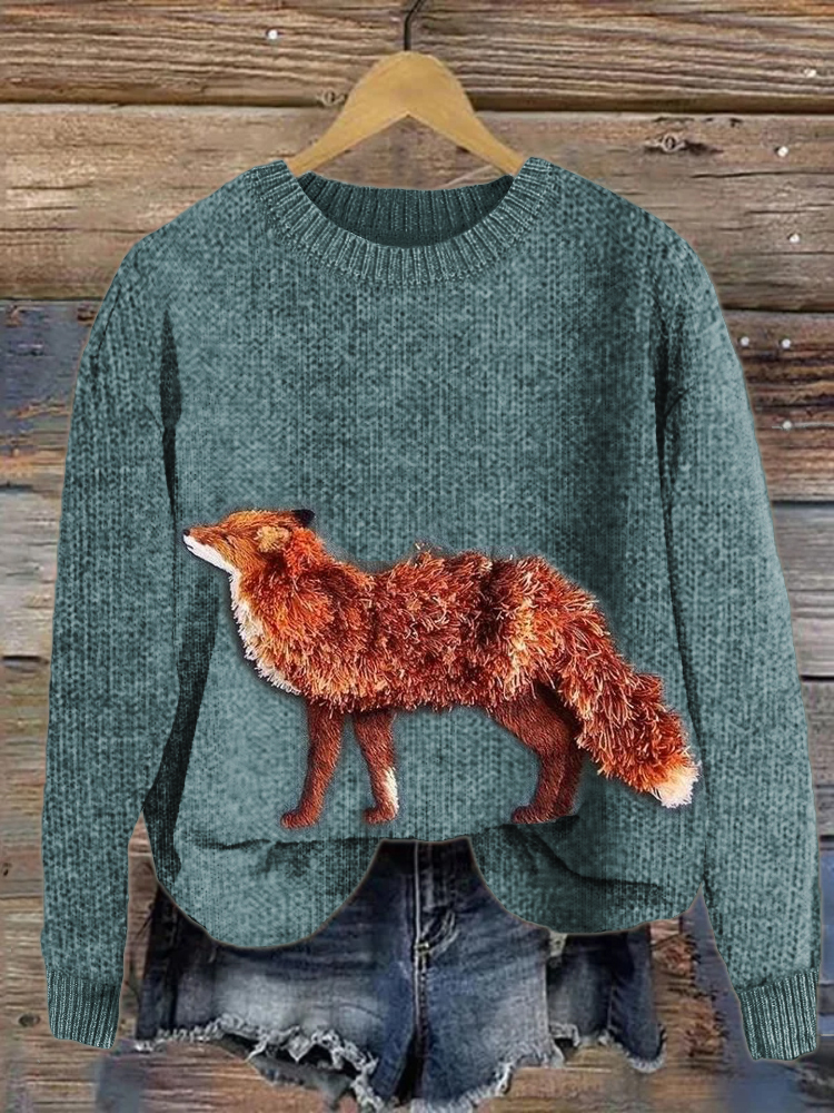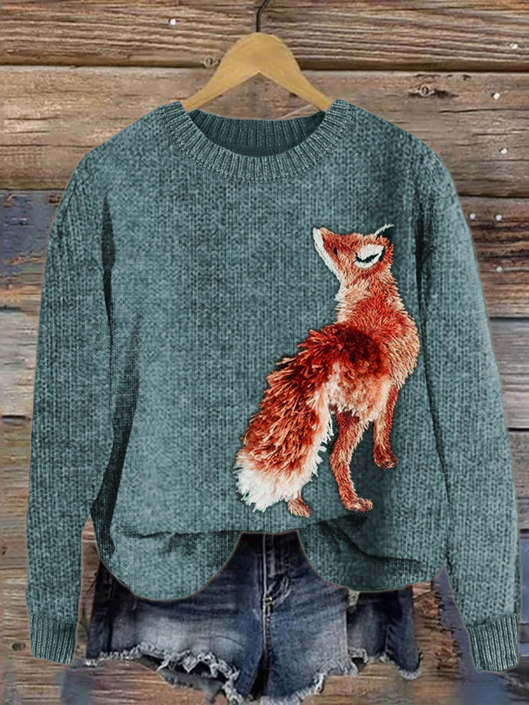 Fuzzy Fox Embroidery Art Cozy Knit Sweater