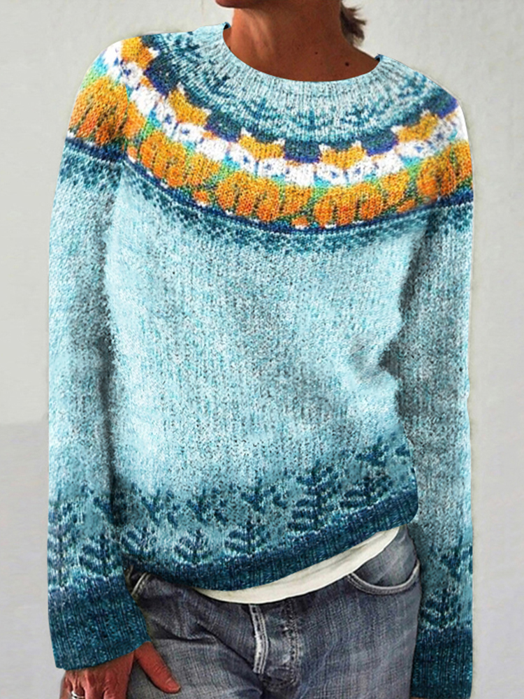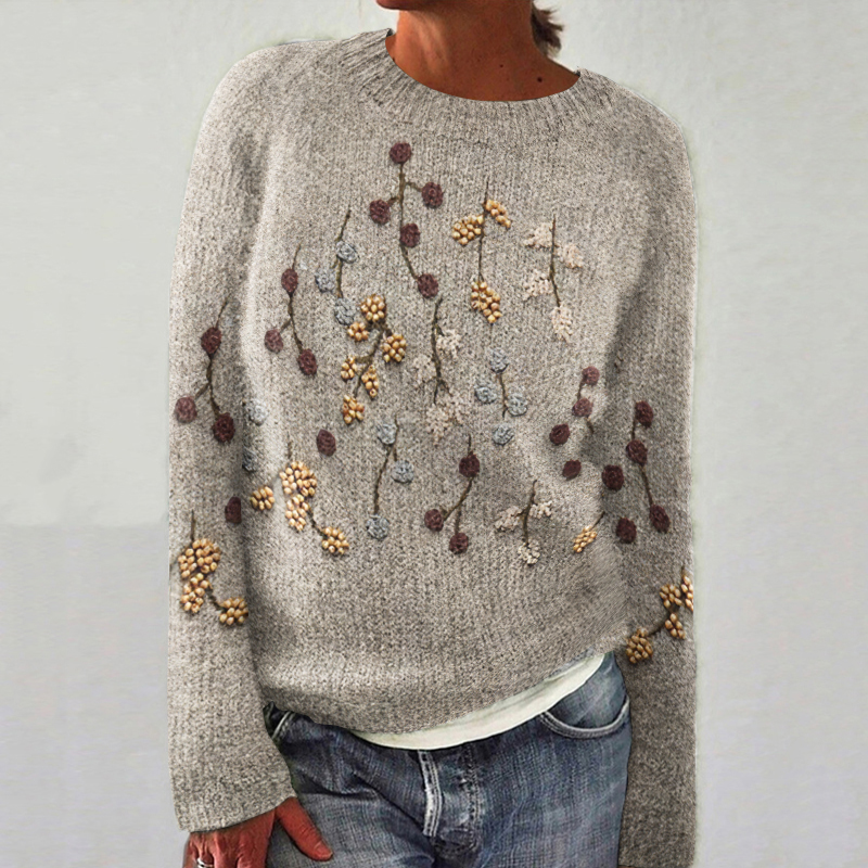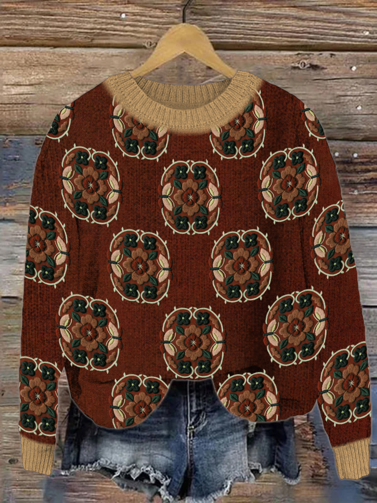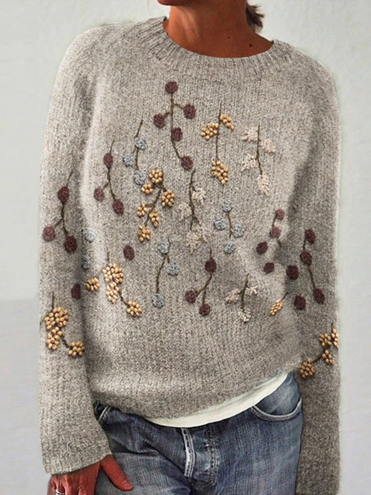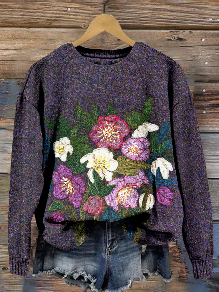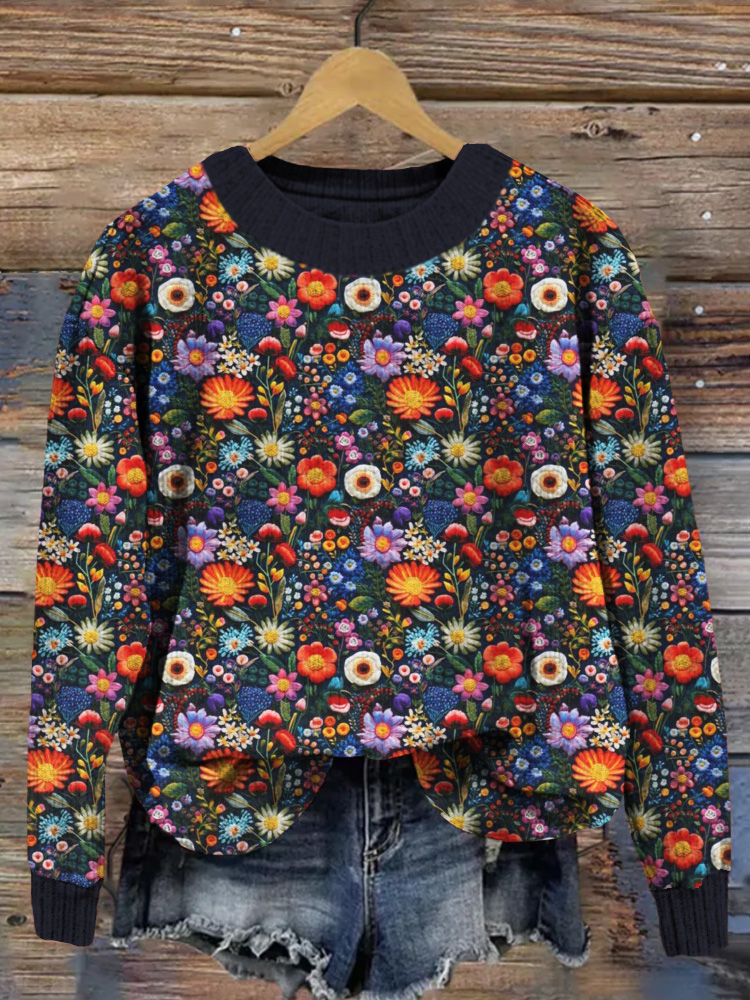 Vibrant Floral Embroidery Art Comfy Knit Sweater