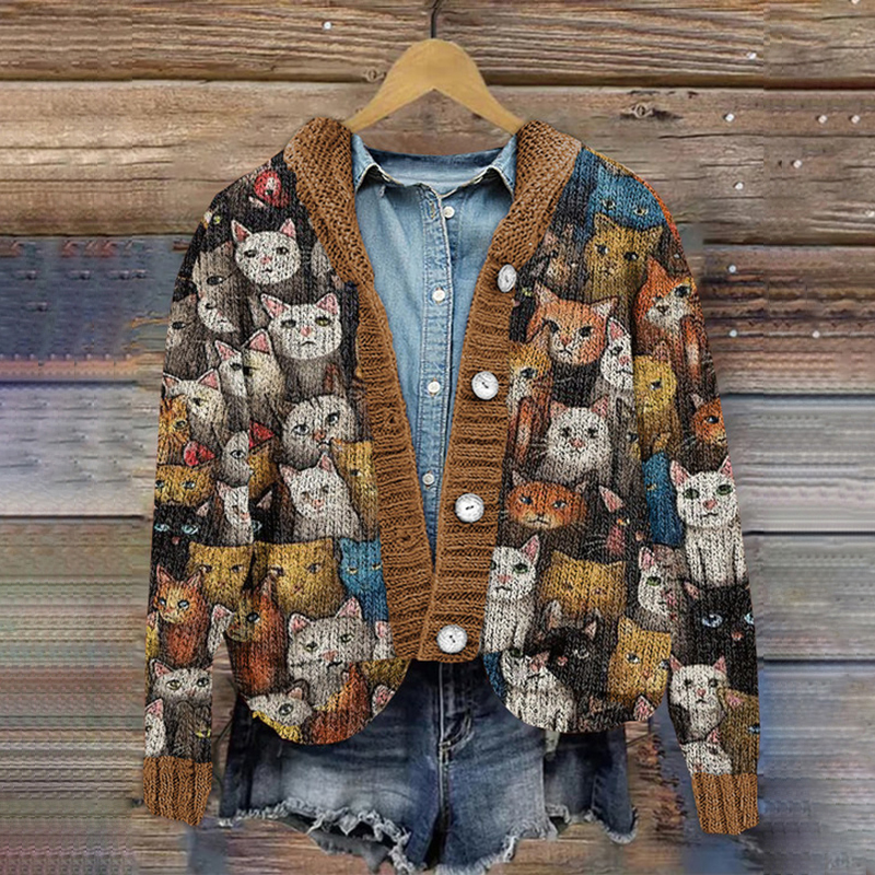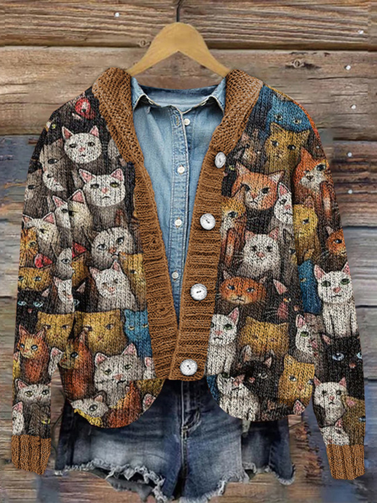 Vintage Cat Print Button Hooded Knitted Cardigan