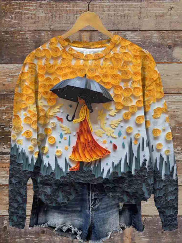 Retro Colorful Girl Holding Umbrella Art Print Casual Crew Neck Sweatshirt