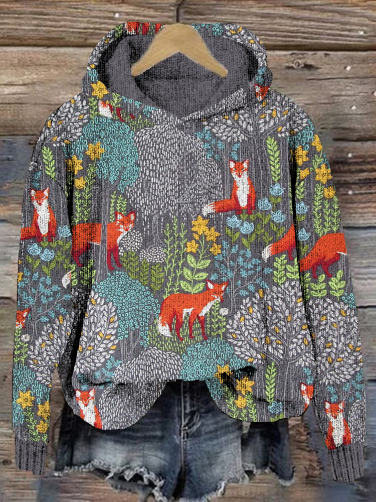 Fox in the Forest Graphic Vintage Cozy Knit Hoodie