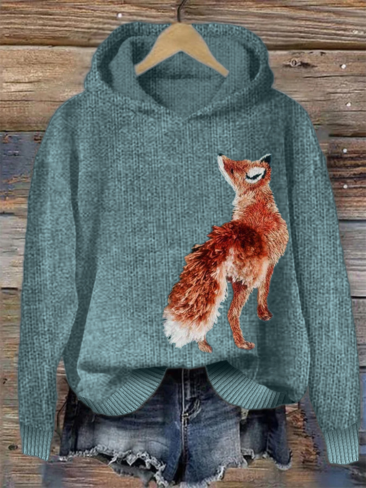 Fuzzy Fox Embroidery Art Cozy Knit Hoodie